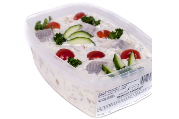 Heringshappen ohne Haut, Äpfel. Gurken, Tomaten, Mayonnaise