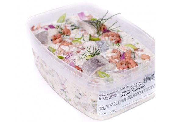 Zarte Heringshappen ohne Haut, Krabbenfleisch, Lauchzwiebeln, rote Zwiebeln, frische Gurken, Sahne, Dill, Mayonnaise